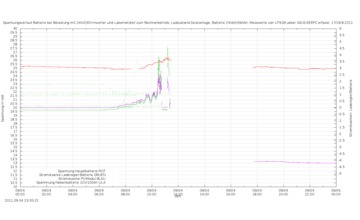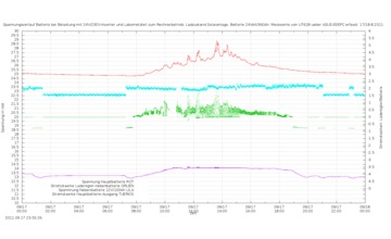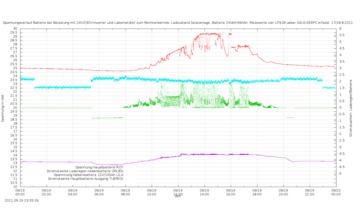 | 07.09.2011  | 08.09.2011   Um 12 Uhr abschaltung des MPPT-Reglers. Der 20V/5A-Kollektor ist jetzt direkt and die Batterie angeschlossen. Dadurch ist Tiefentlade und Ueberladeschutz nicht mehr gegeben und muss manuell gesteuert werden. | 09.09.2011  | |