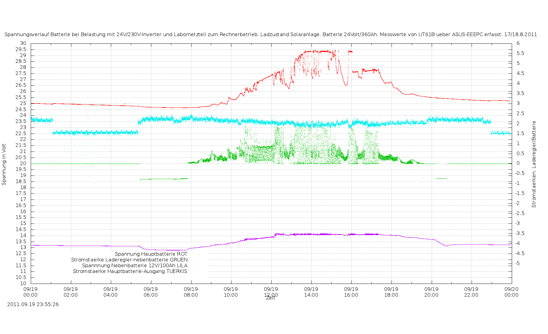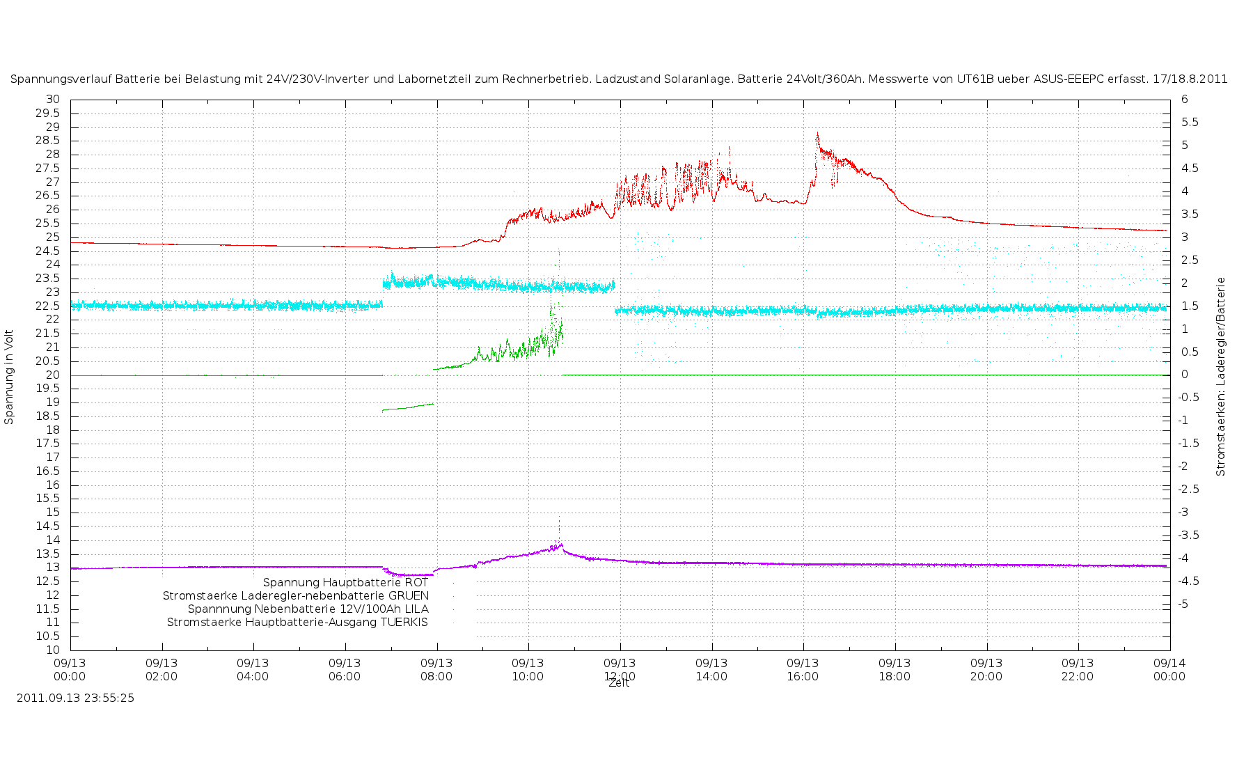 Tag drei des neuen Reglers. Umgebungsbedingungen: Bedeckt/Regnerisch. Sonnenaufgang 6:50.Auf Last wurde in der Nacht bewusst verzichtet. Der Regler nimmt konstant rund 150 mA auf und diese eigene Grundlast muss von dem 200W Modul erst einmal produziert werden, bevor die Batterie gespeist wird. Mit der Stromproduktion beginnt das Modul erstaunlicherweise bereits 20 Minuten vor Sonnenaufgang: 06:34 Uhr +0.001 Ampere Die Hauptbatterie wird jetzt mit ca. 80 Watt belastet und aus drei 200W Modulen gespeist. In der Vergroesserung der Grafik (Ctrl+ im Firefox) fallen mehrstufige Peaks der gruenen PV-Kennlinie auf. Vermutlich handelt es sich um hochfrequente Stoersignale des des Reglers, die in die Modul-Zuleitung einstreuen. Bisheriges Fazit: An einem durchschnittlichen Spaetsommertag reichen 3-4 200W-Module aus, um den zwischen 70 und 130 Watt alternierenden Stromverbrauch von 2 Netbooks, Kabelmodem/Router/Monitor usw. zu decken. In der Zeit von ca. 45 Minuten nach Sonnenaufgang bin ca. 45 Minuten vor Sonnenuntergang. Das gilt bei voll geladener Hauptbatterie. |